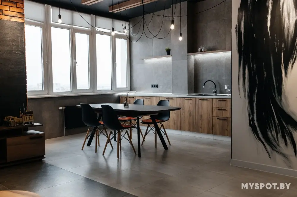 Большая отдельностоящая акриловая овальная ванна для двоих. Просторная кухня-столовая совмещена с гостиной зоной. Вид на реку Сож и близлежашие районы города.