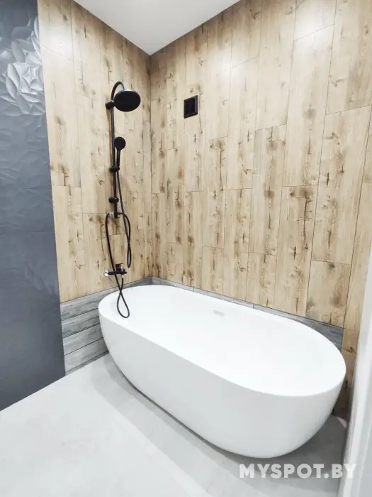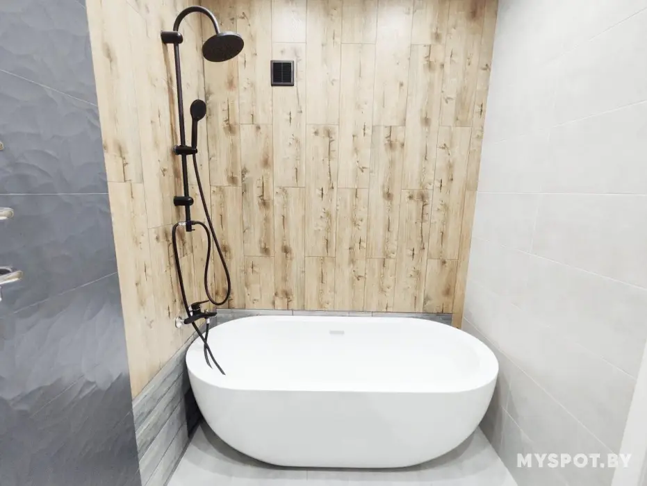 Большая отдельностоящая акриловая овальная ванна для двоих. Просторная кухня-столовая совмещена с гостиной зоной. Вид на реку Сож и близлежашие районы города.